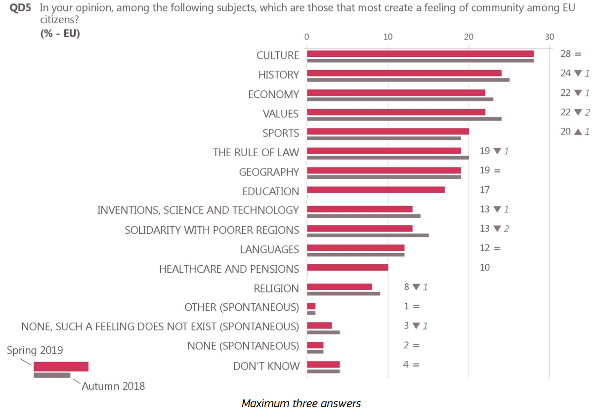 In your opinion, among the following subjects, which are those that most create a feeling of community among Europeans?