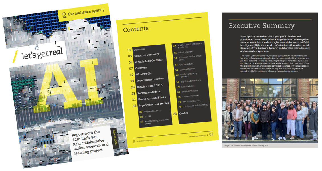Insights from the report have informed our choice of theme for the next Let’s Get Real Programme starting in May 2026 – Let's Get Real: Social Impact + AI. This new cohort will consider how artificial intelligence has the power to reshape the ways cultural organisations engage audiences, improve access, and create social impact. The Audience Agency is looking for up to 20 cultural organisations to join this year’s cohort, with sign up now open until the end of April.
